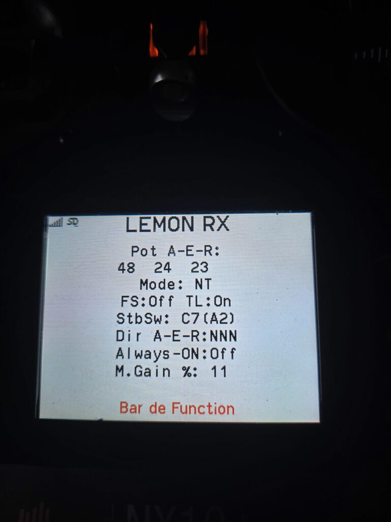 Comme on le fait d’habitude , rien de particulier à cette étape. Le bouton A sera sans aucun effet après bind. En effet , le mode de fonctionnement du récepteur est « Rx only » à réception. On le voit sur l’écran de télémétrie associé au réglage de la stabilisation. Ici en cours de modification.